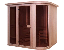 Комфортабельная угловая финская сауна оригинального дизайна отлично будет смотреться как в доме, так и на даче или в загородном коттедже.