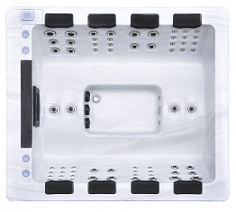 Оснащен 28 гидромассажными и 11 аэромассажными форсунками, которые обеспечивают:
