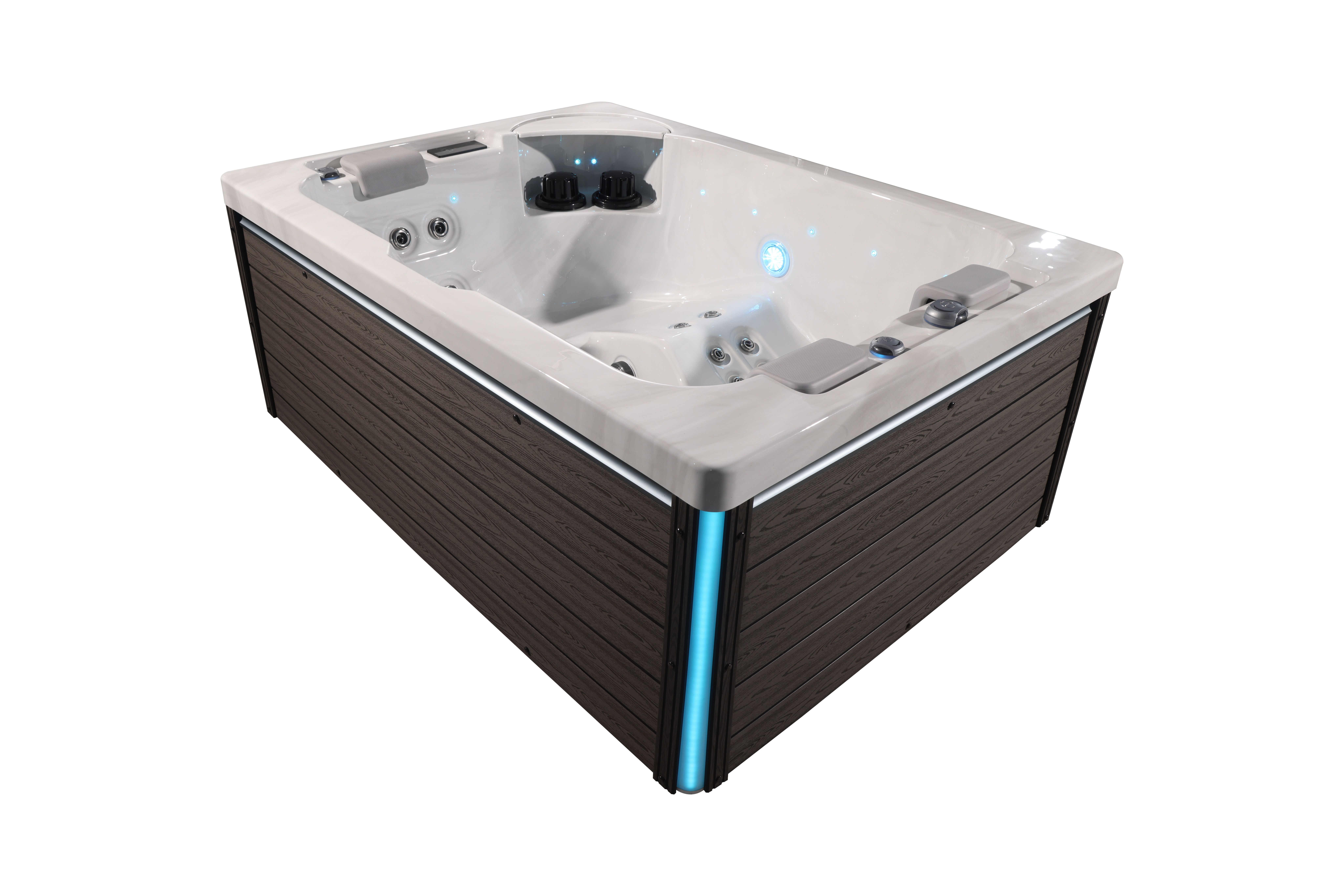 NordicSpa Magni с размером чаши 2,2 x 1,6 м идеально подходит для установки как в помещении, так и на улице. Компактная, но просторная чаша с тремя эргономичными подголовниками комфортно вмещает до трех человек, создавая уютную атмосферу для отдыха и общения.